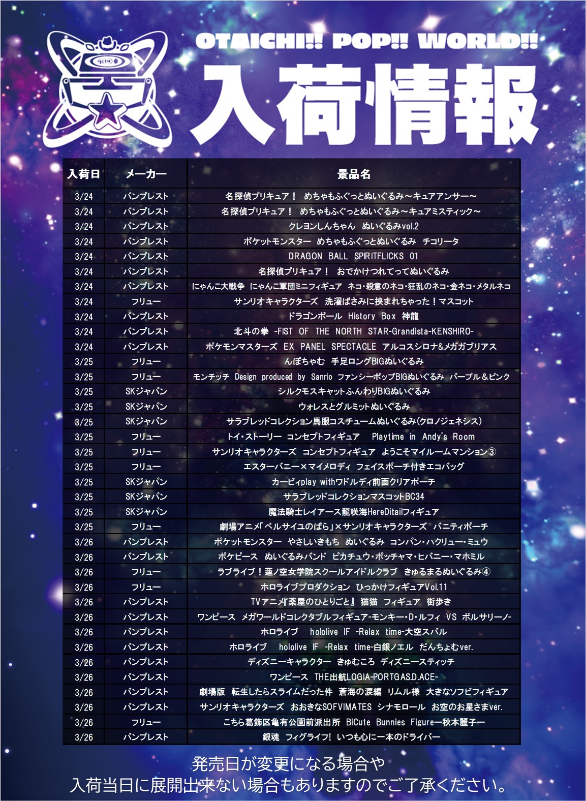 【入荷情報】 こんにちは!OPW岐阜大垣店です🐥 花粉…すごくないですか!!? 目と鼻がグズグズで…という話はさておき、今週もたくさん入荷します✨ というわけで今週(3/24〜3/28)の入荷プライズ情報をお知らせします🏗️👾