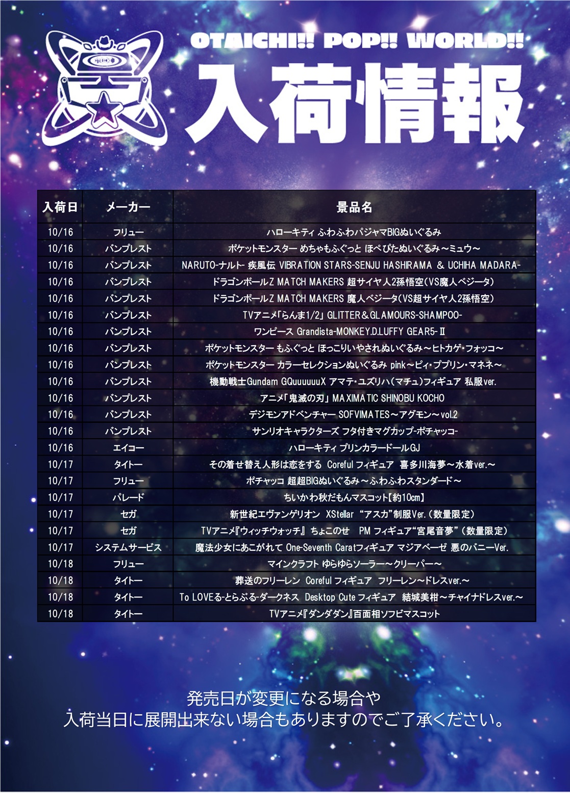 入荷情報(10/16~10/18)
