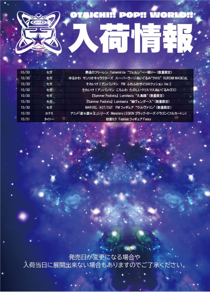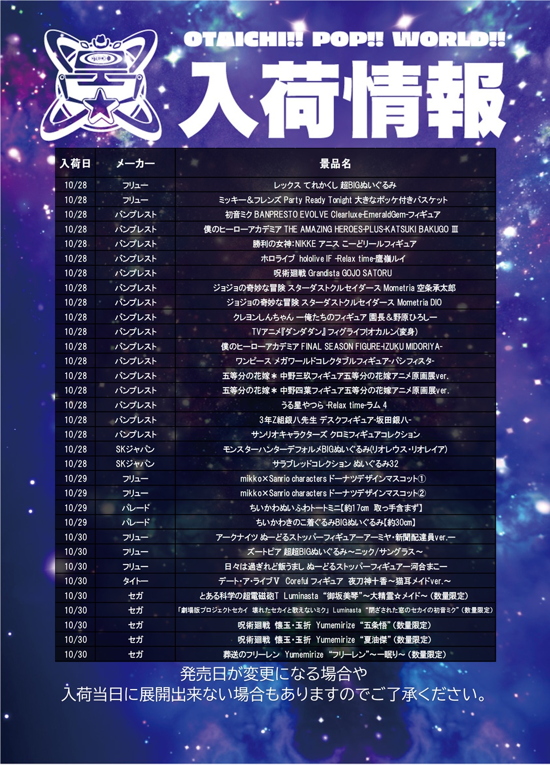 おはようございます☀️ハロウィンイベントお楽しみいただけたでしょうか?来年も楽しみです! さて、今週の入荷情報です!人気あるちいかわや初音ミク、呪術廻戦からは五条さんと夏油が入荷予定となっております! 今週もご来店お待ちしております📷