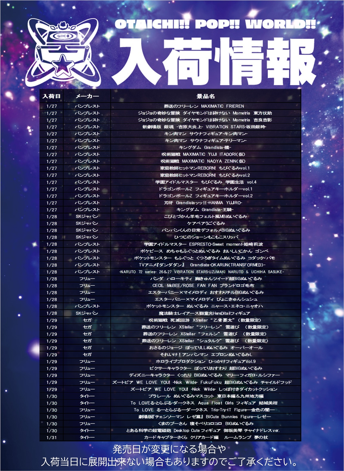 今週(1/27〜1/31)の入荷プライズ...