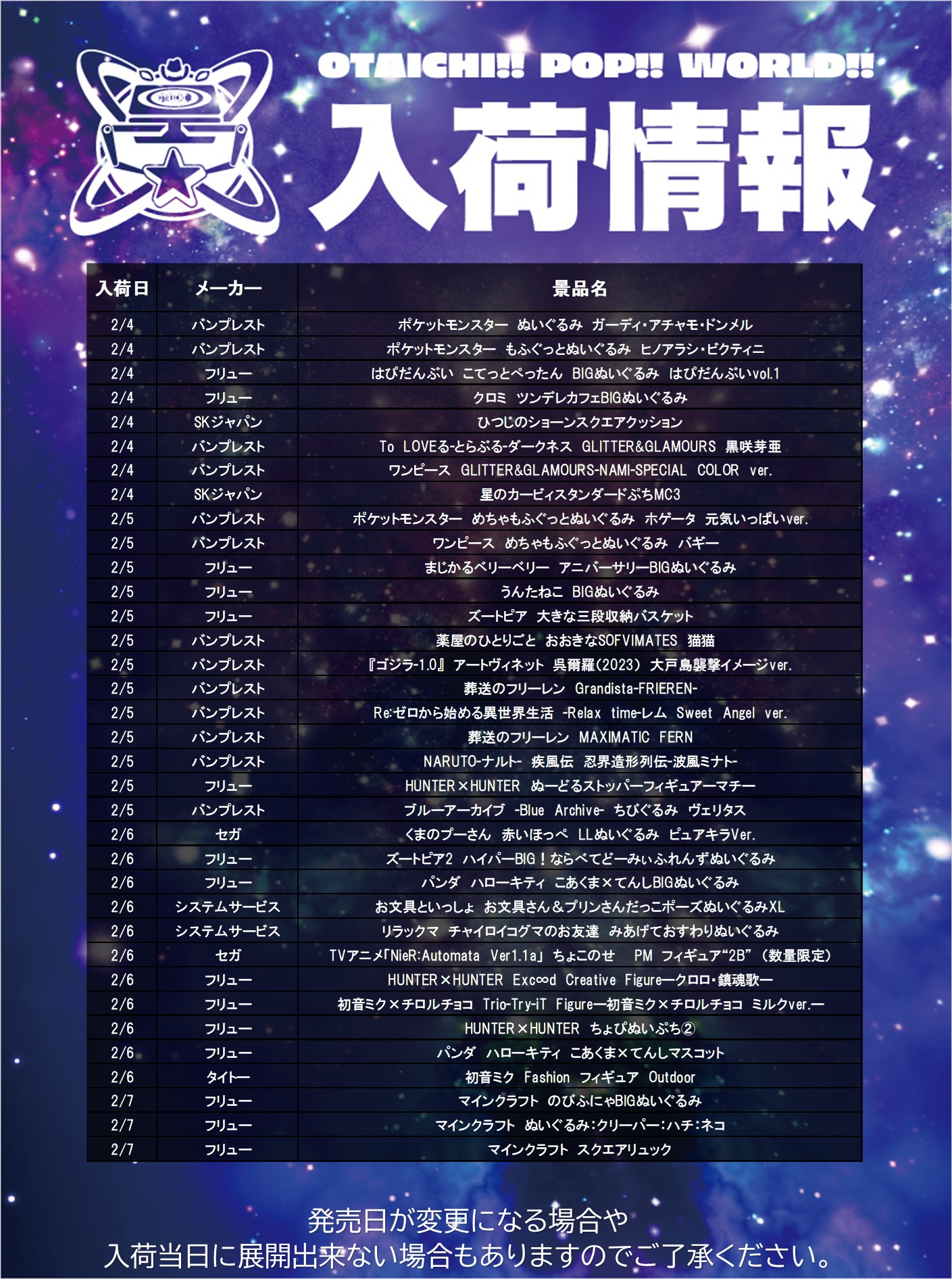 と言うわけで今週(2/4〜2/7)の入荷プライズ情報をお知らせします🏗️👾